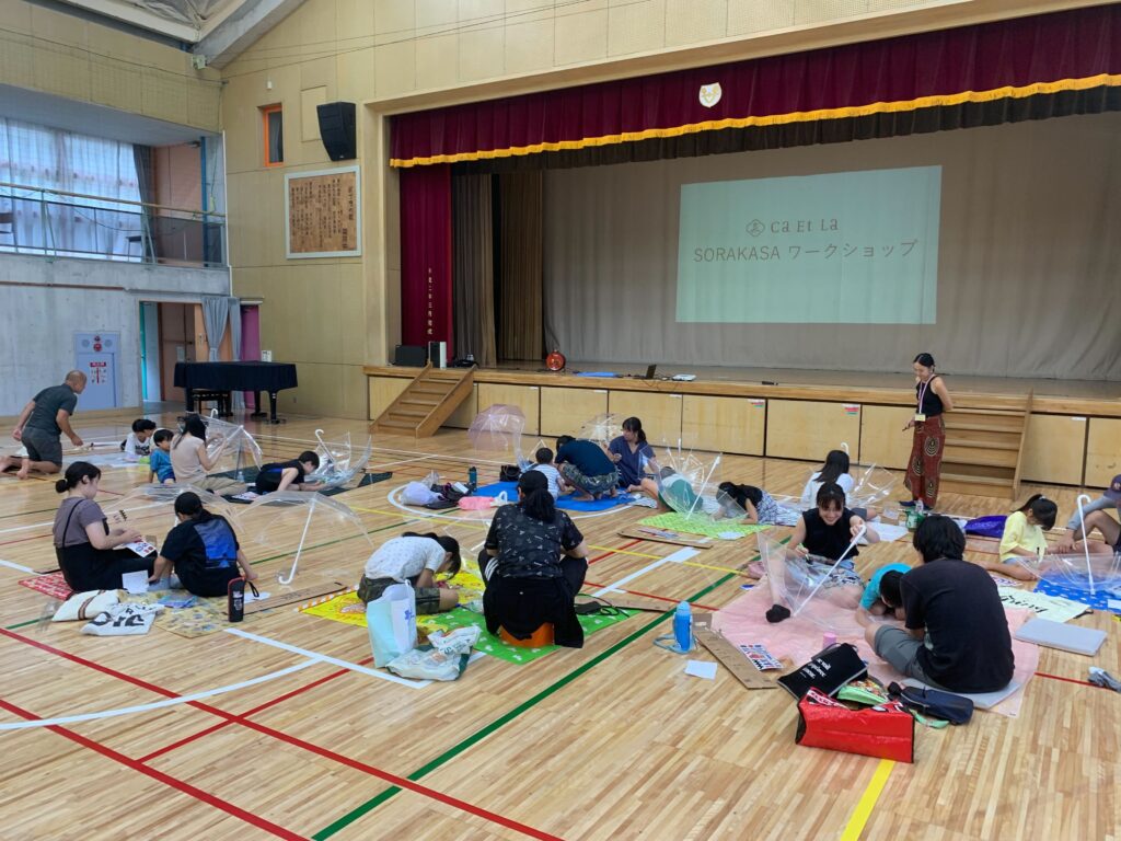 立派な体育館をお借りして、計20名のお客様と一緒に傘づくりを行いました😊